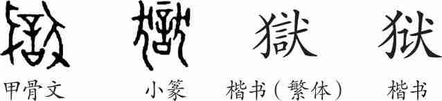 “狱”是会意字。甲骨文左右两边都是“犬”,中间是一个“言”字。小篆线条化了。隶变后楷书写作“獄”。汉字简化后写作“狱”。