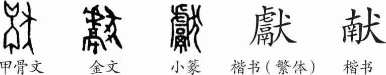 “献”是会意字。甲骨文从鬲(烹煮食物的器皿),从犬,会以犬牲献祭之意。金文另加声符“虍”,小篆线条化、整齐化。隶变后楷书写作“獻”。汉字简化后写作“献”。