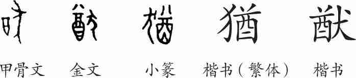 “猷”是形声字。甲骨文从犬,酋声。金文大致相同。小篆只是将偏旁位置调换,其义不变。隶变后楷书写作“猶”,异体作“猷”。现在二字表意有分工。