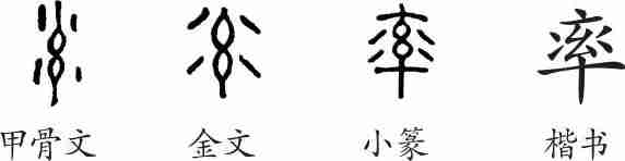 “率”是象形字。甲骨文中间像丝线编织的网,两侧四点像水流,指鱼网。金文的四点外撇,像提网时水滴外溅。隶变后楷书写作“率”。