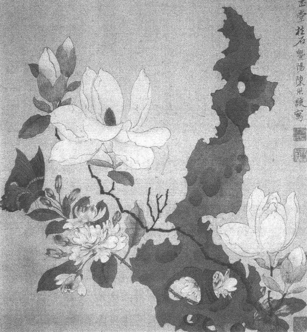 本幅是《杂画图》册中的一开。画面右侧靠近中间部分是一块竖立的太湖石,上尖下大,玲珑剔透。紧靠石块下部伸出一支玉兰,并且斜向左上伸延张展,枝端有一朵玉兰花盛开,另有两朵含苞待放。石头另一侧的后面也露出一支复瓣海棠,花头左上端停有一只双翅并叠的彩蝶。这幅作品构图,采用玉兰干枝斜伸和太湖石直立的交叉方式,避免了正方形构图可能出现的呆板。花、石及蝴蝶的画法均极工细。玉兰花用粉多次轻染,分出浓淡,再用工笔勾勒,烘托出花瓣的肥厚、白嫩。蝴蝶先用轻细的线条勾出轮廓,用淡墨轻色逐层晕染,刻画精确。太湖石的画法是先用淡墨勾出轮廓,然后用浓淡墨多次晕染,逐渐加深,直至显现出丰富的前后层次及石体的转析关系。