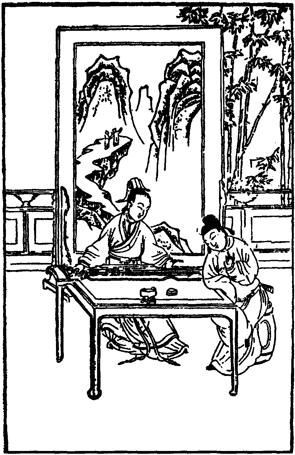 【前腔】 (旦) 朱弦声杳恨溶溶,长叹空随几阵风。(生)仙姑弹得好琴。(旦惊科) 仙郎何处入帘栊,早是人惊恐。(生)小生得罪了。(旦)莫不是为听云水声寒一曲中。(科白从略) (旦)相公你听我道: