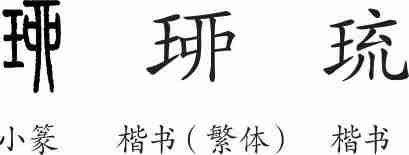 “琉”是形声字。小篆从玉,丣声。隶变后楷书写作“”,异体作“瑠”、“琉”。如今规范化,以“琉”为正体。