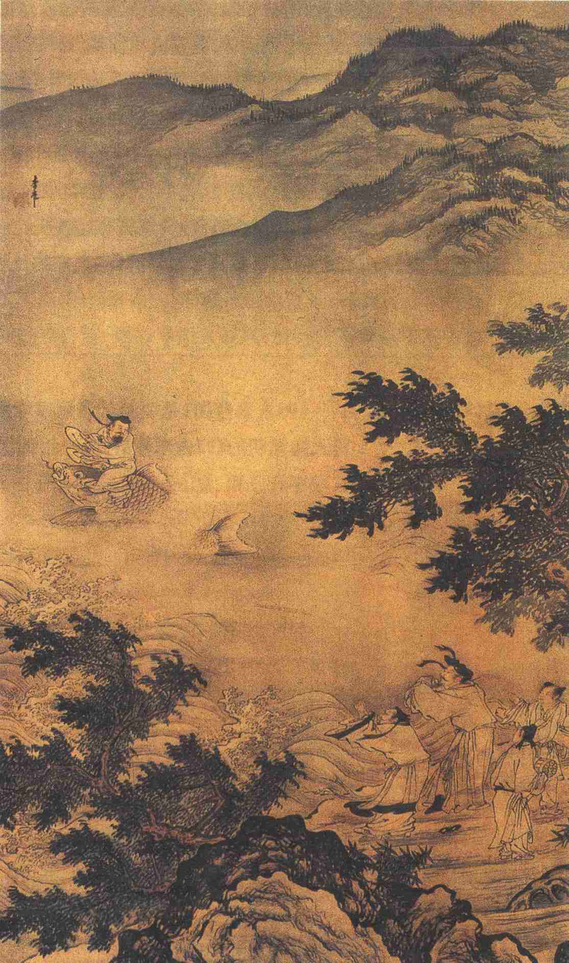 此图画面上河水滔滔,雾气迷漫,琴高跨坐在鲤鱼背上,乘着波浪渐渐远去。他回首眷顾,流露出依依惜别之情。站在岸边上的弟子,弯着身子,拱手仰望,神情肃穆。而站立在后面的两人反应就大不一样,一人手捧书卷,扭头相望;另一携琴的童子,举手指着远去的琴高,面露笑容,表现出一种好奇的神态。作者借这两个次要人物,来衬托琴高与弟子之间的深厚感情。河风吹来,人物的衣裾、幞巾、树叶都飞舞飘扬,极为生动。作者在景物的配置和笔墨的运用上都作了精心的安排。树石和远山处于画幅的边缘,中间留出大片空白,既突出了主题,又显得天、水的宽阔。山石皴法一变常用的斧劈皴,而是吸取了元代文人画家的表现技法,融合披麻皴、解索皴为一体,加以变化,笔势劲疾,富有动感。墨的浓淡对比强烈,淋漓尽致。综观全图,笔墨精纯熟练,且充满动势。在这河水翻腾、野风狂裂、山动水跃的环境中,生动地刻画了琴高乘鲤仙去的情景。画的左上方署款“李在”。