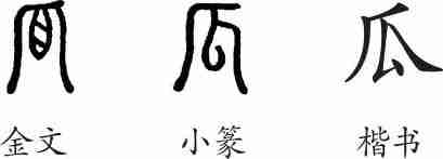 “瓜”是象形字。金文像长长的瓜蔓,中间有一个已经成熟还结在蔓上的大瓜。小篆线条化。隶变后楷书写作“瓜”。