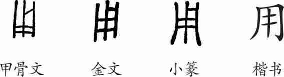 “用”是象形字。甲骨文像一只木桶,可见“用”是“桶”的初文。金文与甲骨文一脉相承。小篆的写法进一步线条化。隶变后楷书写作“用”。