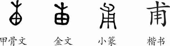 “甫”是象形字。甲骨文像田中长有菜苗,是“圃”的本字。金文上边稍讹。小篆讹为从用,从父。隶变后楷书写作“甫”。