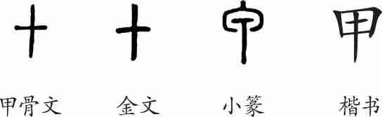 “甲”是象形字。甲骨文像古代武士身上穿的铁甲片之间的“十”字缝。金文的形体同于甲骨文。小篆的形体变得艺术化了。隶变后楷书写作“甲”。