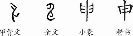 “申”是象形字。甲骨文像雷雨天闪电舒张的形状。金文与甲骨文很相似。小篆将闪电拉直,线条化了。隶变后楷书写作“申”。