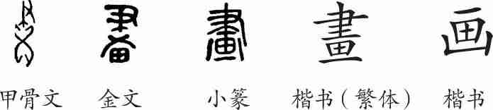 《说文·畫部》:“畫,界也。象田四界。聿,所以画之。凡畫之属皆从畫。”(畫,畫分界限。像田和四周的界畫。聿,是用来分界限的器具。大凡畫的部属都从畫。)