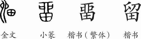 “留”是会意兼形声字。金文从田,从卯(剖割),会田间收割有遗留之意,卯兼表声。小篆整齐化。隶变后楷书写作“畱”。异体作“留”。如今规范化,以“留”为正体。