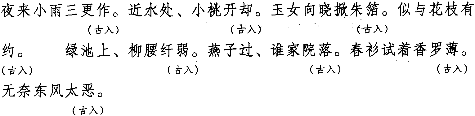 注: 本词例押古入声“药” 韵。因 “药” 在现代韵中属 “高” 韵,故全词可押高部“高”韵。又因 “作” “落” “弱” 在现代韵中属“波” 韵,而“却”“箔” “约” “薄” 在古韵中与 “作” “落” “弱” 同韵,且“恶” 在古韵中亦与“作” “落” “弱” 同韵,故全调可押现代韵歌部“波”韵,亦可押歌部“歌”韵。