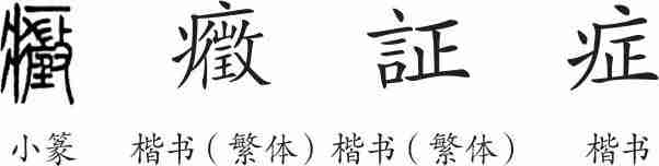 “症”是形声字。小篆从疒(表示与疾病有关),徵声。楷书繁体写作“癥”。汉字简化后写作“症”。后又用作“證”的简化字。