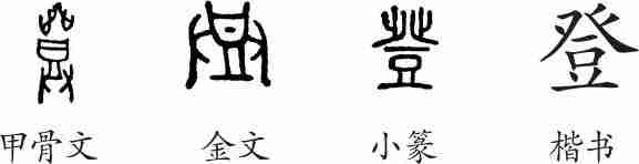“登”是会意字。甲骨文会双手捧举食器进献之意。金文将两只脚省掉了。小篆下部的双手被省掉。隶变后楷书写作“登”。