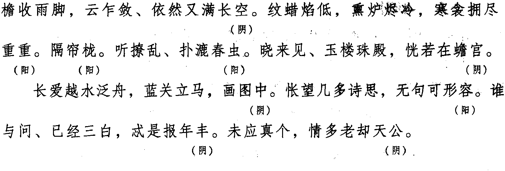 本格双片九十五字。全词同韵,平韵,韵字可阴平、可阳平。原为古琴曲,意取凛然清洁、雪竹琳琅之意。属高雅之乐,故宋人用于词牌。