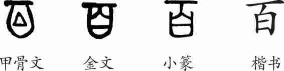 “百”是指事字。甲骨文形体是在“白”字之上加“一”为指事符号,与“白”相区别。金文与甲骨文大致相同。小篆整齐化、符号化。隶变后楷书写作“百”。