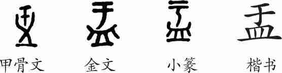 “盂”是形声字。甲骨文从皿,于声。金文和小篆都是从甲骨文演变而来。隶变后楷书写作“盂”。
