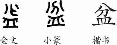 “盆”是会意兼形声字。金文和小篆皆从皿,从分,会底小口分张而大的器皿之意,分兼表声。隶变后楷书写作“盆”。
