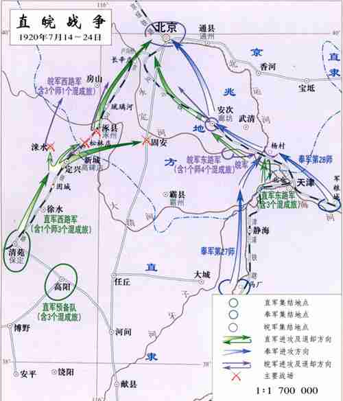 袁世凯死后,北洋军阀分裂为直、皖、奉三大派系,以曹锟、吴佩孚为首的直系军阀盘踞直隶(今河北)等地;以段祺瑞为首的皖系军阀占据京津等地区;以张作霖为首的奉系军阀占据东北三省。其中长期控制北京中央政权的皖系同具有较强实力的直系军阀之间的矛盾日趋激烈,终于在1920年7月14日正式爆发战争。双方分别组成西、东两路军。皖军西路军将其3个师1个混成旅部署于涿县(今河北涿州)、固安、涞水以北,企图沿京汉路南下,首先夺取清苑,然后继续南进。直军以吴佩孚为前敌总指挥兼西路军总指挥,率1个师3个混成旅部署在涞水、涿县、固安一线以南,抗击皖军进攻。当日晚,双方在西线发生激烈战斗。同日,东路皖军1个师4个混成旅向杨村的东路直军阵地发起进攻。直军在铁路桥架设大炮向皖军轰击,双方一时胜负未决。16日,驻防天津的日军护路队强迫直军退出其防地2英里(1英里约等于1.6千米)以外,直军防线被打开一个缺口,皖军乘虚而入,直军不支,遂放弃杨村,退守天津北仓。17日,西路直军在主动退出高碑店后,吴佩孚亲率一部精锐部队,采取侧翼迂回战术,向涿县、高碑店之间的松林店实施突击,直捣皖军西路军前敌总部。直军攻占松林店,俘西路皖军司令部全体高级将领,西路皖军因失去指挥而迅即败退。当日,直军攻占涿县并继续向前推进。18日,直军进占琉璃河。20日,直军进至长辛店、卢沟桥,将溃散的皖军肃清。在东路,奉系军阀放弃“中立”立场,派其第27、第28师数千人于17日抵达天津,并迅速投入支援直军的战斗。18日直军收复杨村,直趋廊坊,皖军在东路全线败退。19日,皖系军阀首领段祺瑞通电辞去身兼一切职务。23日,直、奉两军先头部队开进北京。24日,直军接管北京防务。