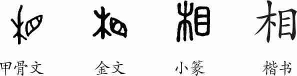 “相”是会意字。甲骨文从木,从目,会用目来看树木之意。金文大体相同。小篆直接从甲骨文、金文演变而来。隶变后楷书写作“相”。