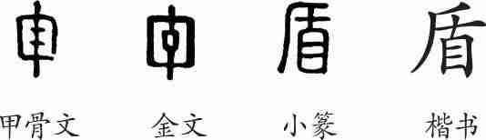 《说文·盾部》:“盾,瞂也。所以扞身蔽目。象形。凡盾之属皆从盾。”(盾,盾牌。用来捍卫身体、蔽护头目的东西。象形。大凡盾的部属都从盾。)
