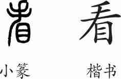 “看”是会意字。小篆从手,从目。人们向前看时,习惯把手放在额头上,以遮挡阳光,“看”的字形正是这一姿势的缩影。隶变后楷书写作“看”。