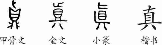 “真”是会意字。甲骨文从鼎,从人,会人就鼎取食美味之意。金文和小篆略有变化。隶变后楷书写作“真”。