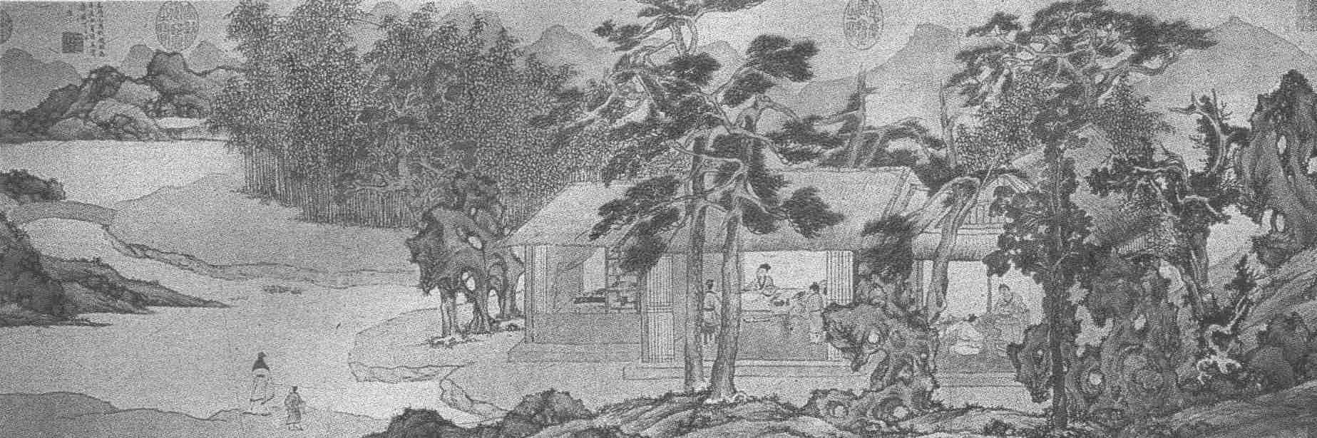《真赏斋图》卷,有两本,画面不尽相同,都是文徵明先后为华夏所作的。两图作画时间相距八年,这里介绍的是他画的第一卷。文徵明和华夏是知交。华夏字中甫,无锡人,善于精鉴古代书画,收藏宏富,藏有钟繇《荐季直表》、王羲之《袁生帖》、颜真卿《刘中使帖》、王方庆进呈的《王氏一门法书》、张旭草书《古诗四帖》等稀世名迹。此图描写华夏在自己的真赏斋中与来客对话论艺,旁有童仆侍候的情境。屋的右旁及对面,均布置兀立的湖石假山,玲珑剔透。左方近处有主仆二人缓缓行来相会。书斋数间位于中部,前有长松数株,杂以古柏,绿荫扑人眉宇,屋左亦有湖石簇拥书斋。隔岸竹林一片幽静深邃,后有远山如带,横亘卷尾左上角,前有坡石点缀,疏密相宜,布置妥适,极有意境。这是文徵明八十岁时的晚年之作,笔致细腻精能,较之他在八十八岁时作的《真赏斋图》第二卷要精彩许多。那时他已年老体衰,笔墨滞重,只有近景而无远景,较为逼塞平板,不如此卷的生动而具灵气。第二卷《真赏斋图》今藏中国历史博物馆。