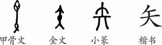 “矢”是象形字。甲骨文、金文就像箭的样子。小篆线条化,形象已经变得抽象。隶变后楷书写作“矢”。