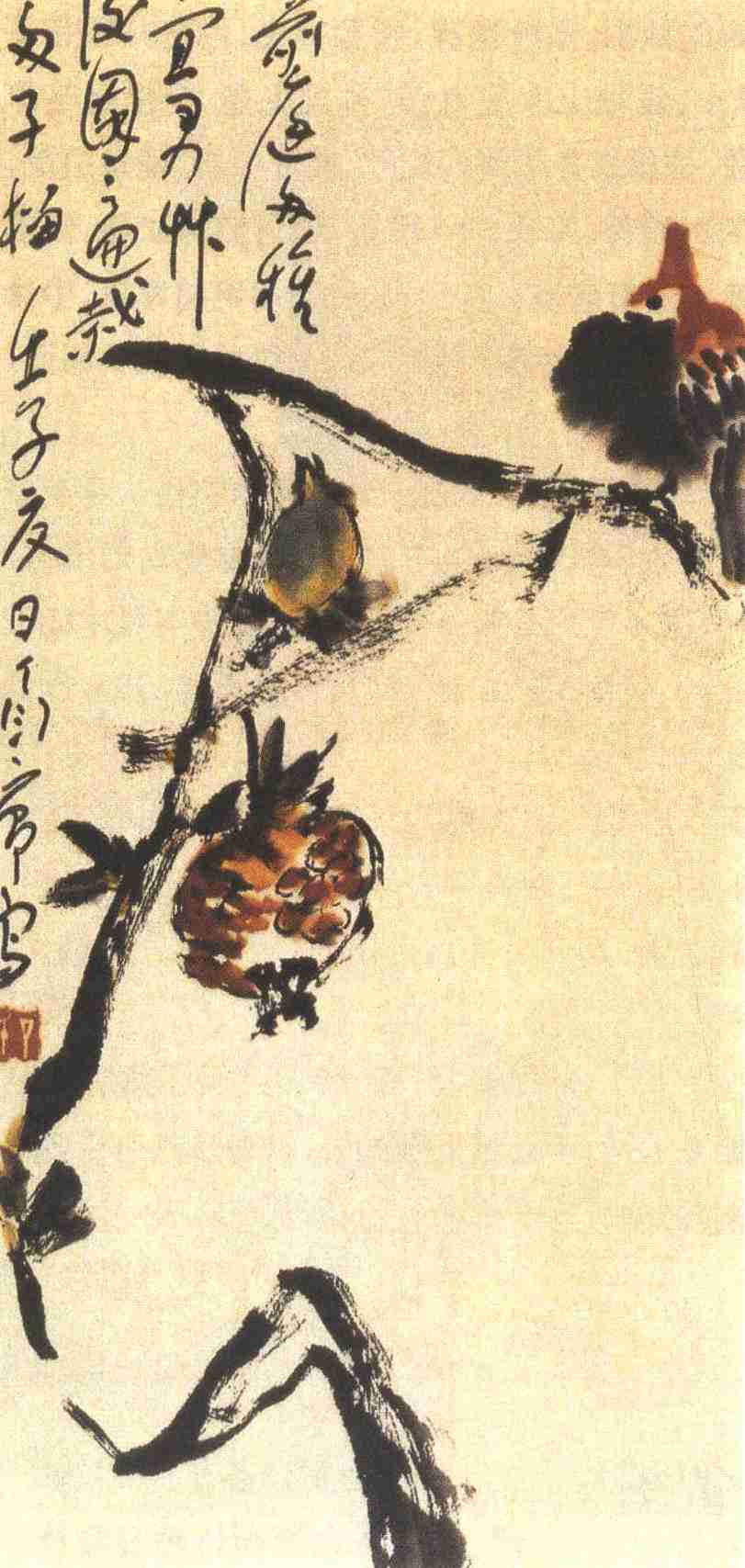 一只彩雀停落在石榴枝的一段,其身体之肥硕仿佛有将枝干压断之虞,从这种突兀而又简练的构图,形态怪异的彩雀和石榴上,不难看出徐渭和朱耷的遗风。