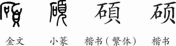 “硕”是形声字。金文从頁(头),石声。小篆承接金文并整齐化。隶变后楷书写作“碩”。汉字简化后写作“硕”。