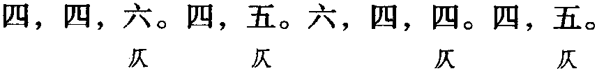 本格双片九十八字。全词同韵,仄韵,韵字可上声、可去声,古韵多入声。另有七十五字、七十四字、七十三字各体,且句式各异。见晏几道、晁补之、程垓等词。