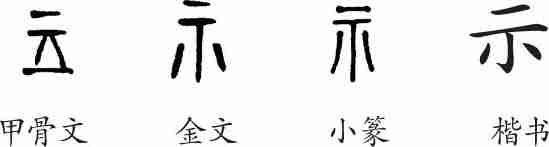 “示”是象形字。甲骨文像用两块石头搭起的简单祭台之形。金文把甲骨文的底座变为“小”,表示供桌的支架。隶变后楷书写作“示”。