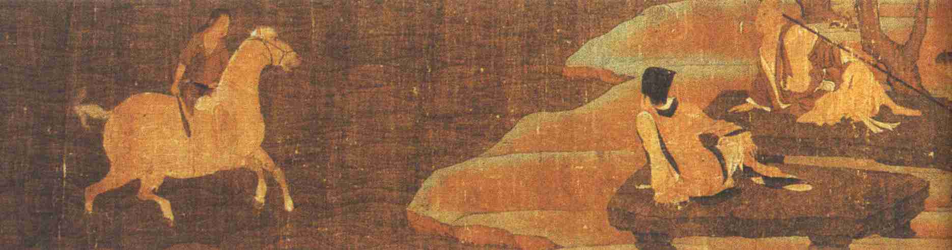 这幅画卷的作者,被宋人指认为唐代名画家韩幹,多少有他的根据。如僧人、名士支遁和马童的形象,眉清目秀,下颔肥而上额狭窄,口唇薄小,是中唐的时代画风,在敦煌石窟的壁画中可以得到许多印证。西域侍者的造形,也是从壁画那里脱化而来。名士的衣冠,一般说来,具有晋人的高冠宽衣薄袖的特点,但他笔下的人物,给人的印象却接近于《韩熙载夜宴图》中的主人翁,而且敷色和线描也基本一致。这不是一种巧合,恰恰是受时代风格的制约所致。它不是随人们的主观愿望为转移的。因此,宋人题笺指为韩幹,通过作品的具体分析,不能作为依据。尽管作者不一定是韩幹,而他的真实姓名又无从查考,就画论画,实在是五代年间流传下来的技巧精湛的名作!它保存并发展了我国古代绘画的优良传统,丝毫没有受士人画专求笔墨趣味的干扰。无名胜于有名,通过它,可以了解古代民族绘画的精髓。
