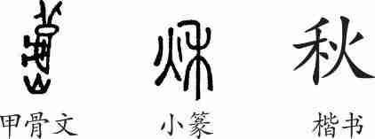 “秋”是象形字。甲骨文像一个蟋蟀的形状。金文加上了义符“禾”,表示庄稼。隶变后楷书写作“秋”。