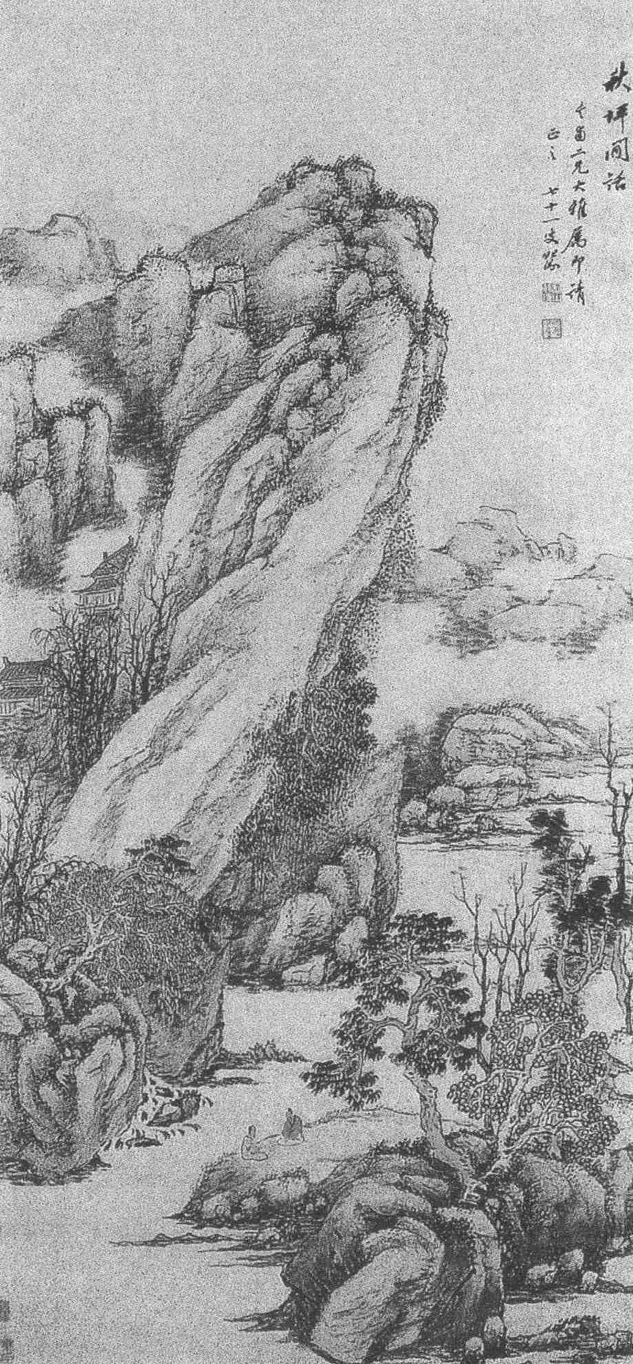 这幅《秋坪闲话图》描写深山野岭中两位高士在水涯坡地上,闲坐交谈的景象,是画家崇尚简淡生活的情感寄托。中景处画一峰突兀,杂木秋叶,水流潺湲,有楼台亭阁隐隐约约在山岚雾气中闪现。远山苍茫,画家用淡墨轻抹来表现,把烟云笼罩、空山罕有人迹的气氛烘托得恰到好处。画面前景处生有一块巨大的坡石,即所谓的“秋坪”,秋坪上有两人,一红衣,一灰衣,正在对坐闲语,真是对“行到水穷处,坐看云起时。偶然值林叟,谈笑无还期”(王维《终南别业》)的绝妙诠释,看似寥寥的用笔,却体现着无声诗的意境。试观整幅画,用笔较为松秀,以干笔渴墨皴擦、点苔,有枯中见润的意味。坡石杂树,枝干挺拔。画树叶用夹叶、点叶法,或双钩出树叶的形状,或小笔点簇,上罩花青、赭石,浅绛设色用来得心应手。