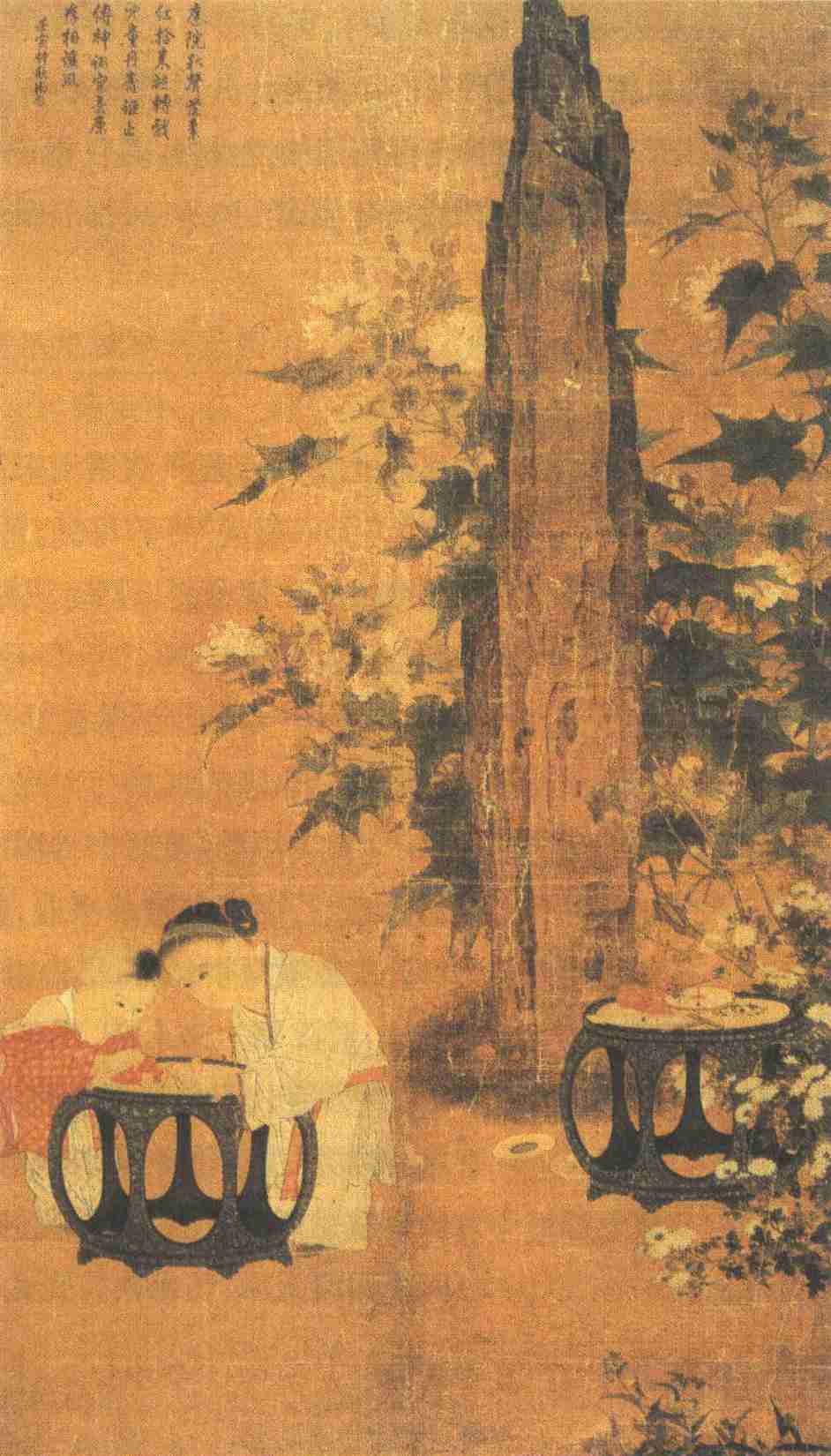 此图上无名款,传为苏汉臣所作。他是南宋著名的人物画家,宣和画院待诏。“工画道释人物臻妙,尤善婴儿”(《图绘宝鉴》卷四)。宋代擅画儿童画的画家较多,如刘宗道、刘宗古、杜孩儿、陈宗训等,但以苏汉臣造诣最高,影响最大。其作品流传至今已寥寥无几,带名款的只有一件《婴戏图》册页,藏天津艺术博物馆。《秋庭戏婴图》不唯婴儿神气完足,墨石花卉亦精妙,在苏汉臣传世作品中较有代表性。