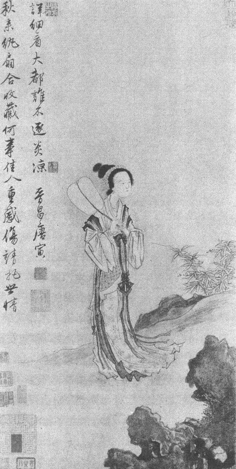 “新裂齐纨素,鲜洁如霜雪。裁成合欢扇,团团似明月。出入君怀袖,动摇微风发。常恐秋节至,凉飙夺炎热。弃捐箧笥中,恩情中道绝。”这是汉班婕妤的《怨歌行》。明代画家唐寅的《秋风纨扇图》就是借这首诗而作的一幅水墨写意画。唐寅运用兰叶描与折芦描笔法,线条流畅而又顿挫,形象既洗练而又有韵味,笔墨简疏,色调淡雅,允是文人画中之杰作。