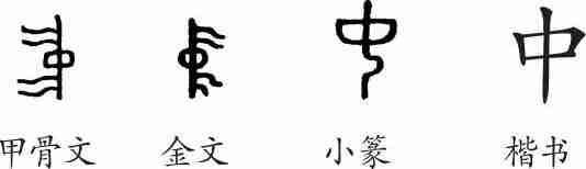 “中”是象形字。甲骨文像一面直立的旗帜,居中的“囗”表示“中间”之意。金文、小篆变得更加美观。隶变后楷书写作“中”。