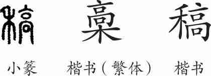 “稿”是会意兼形声字。小篆从禾从高会意,高兼表声。隶变后楷书写作“稾”,俗作“稿”。如今规范化,以“稿”为正体。