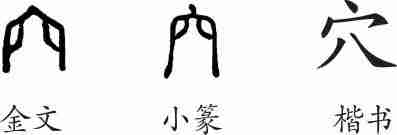 “穴”是象形字。小篆像古人居住的半地下土窑之形。金文很像土室或岩洞。小篆与金文差别不大。隶变后楷书写作“穴”。