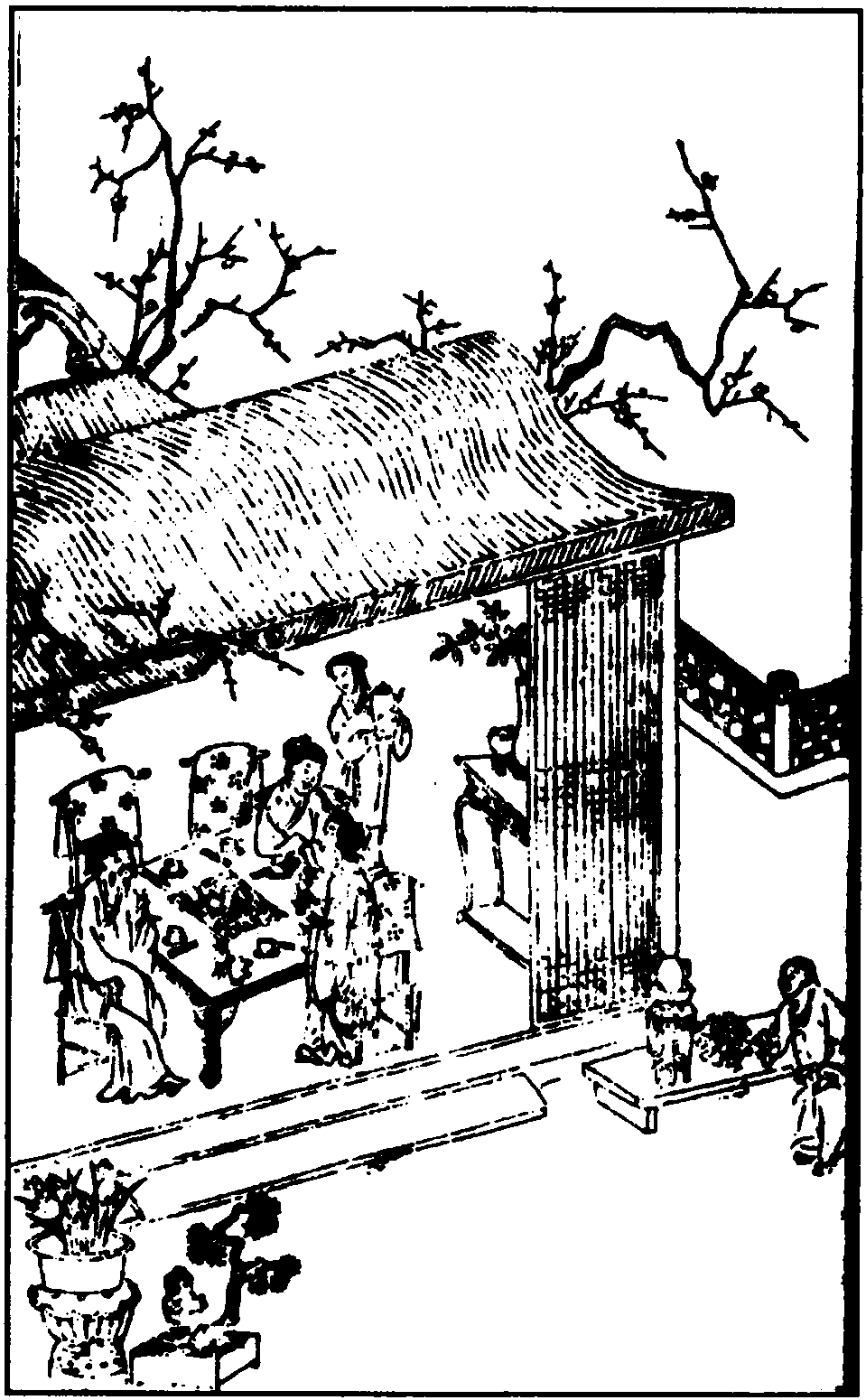 【双鸳鸯煞尾】 (末)走天涯何处把骚魂瘗?觅仙方无计把痴肠替。一任他繁华梦,莺声唤起。黑漆漆梦中朝,密排排皇家历,急促促愁人晷。收拾梦花盟,猜破雕虫谜。(舞介) 对东风舞一回,则他那桃花坞土一堆。(指段介) 蒲东寺难问崔,(指空介) 鹦鹉洲谁姓祢?提破了生天后世因,忏过了绮语今生罪。(张) 幼于已醉。(末) 醉次第,朝来第一。(段)我们亦从此告别。(末) 呀,诸君正未可别也。还待梦儿中剪烛话清宵,只要你向影好窗西唤张敉。