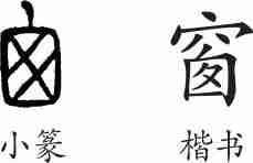 “窗”是象形兼会意兼形声字。小篆像天窗之形,即在屋上留个洞,可以透光、出烟。由于“囱”后来专门指烟囱,故另加义符“穴”来表示天窗。隶变后楷书写作“窗”。