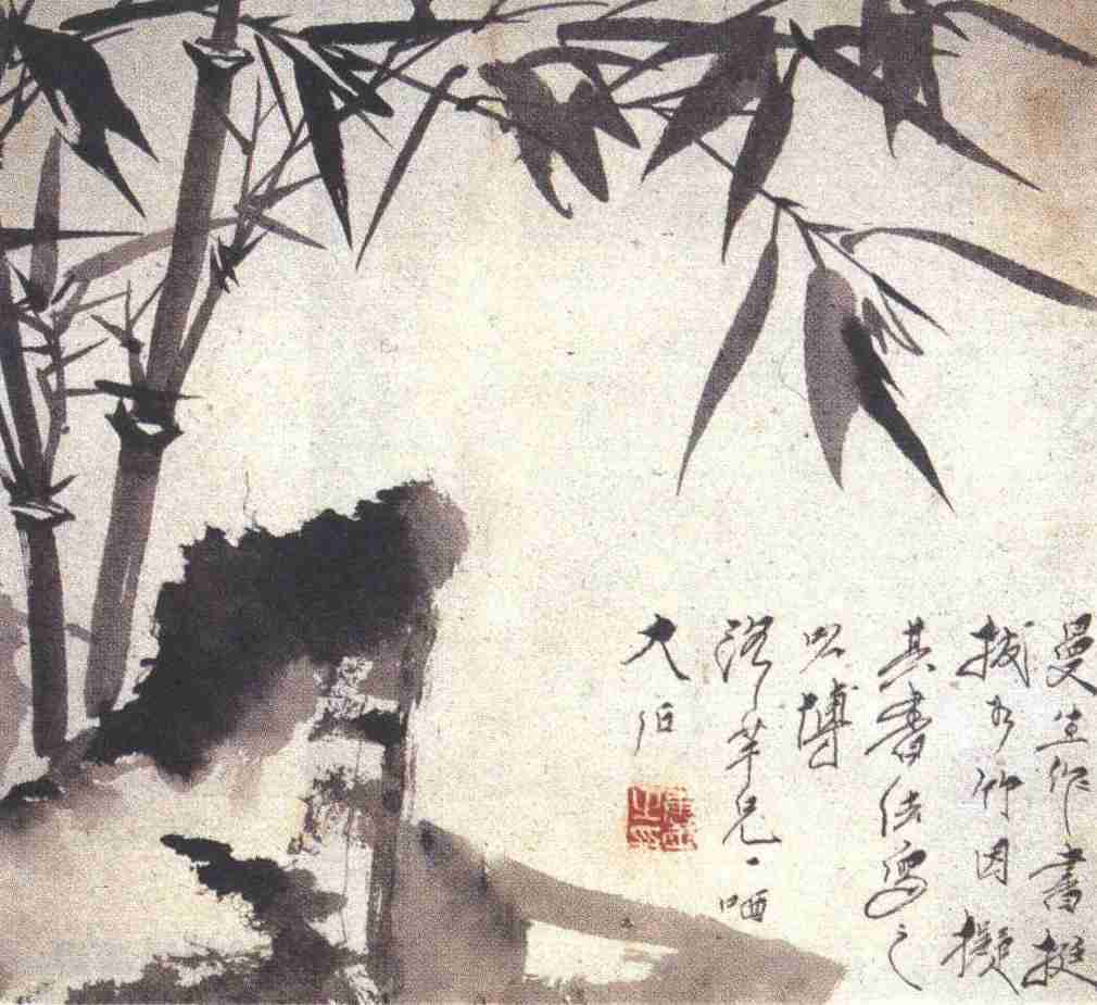1965年是唐云早中期画风体貌登峰造极的时际,力度倍见沉着透纸,洒脱已臻自然,秀丽也趋雅淳,笔墨自始至终鲜活贯气。这第一张《竹石图》,青筠两枝从石隙间冲出画面,添以细枝,即撇写竹叶,并不刻意于浓淡干湿,却见飘逸闲散,清俊脱俗,仅仅在前端的下垂细枝上添上两片浓墨竹叶,这两笔不经意处却醒目了。一石耸起,石上端浓墨点簇,大笔提挈耸神,石后用阔笔淡墨扫出几笔似坡如石,两石前后一竖一横,托起了两竿青琅玕。唐云在右下方兴致勃勃地题上:“曼生作书挺拔如竹,因拟其书法写之。”饶有情意也。
