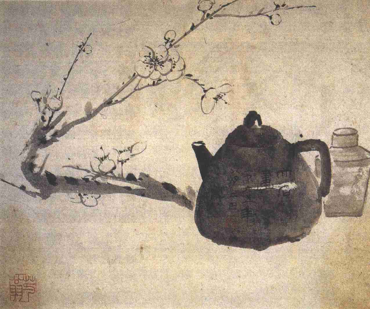“在曼生的尺牍集子里要画上一把茶壶。”唐云于是在另一纸副页上画了三物:紫砂茶壶、锡茶罐、折枝梅,名日《雅趣清品图》。唐公以阔笔淡墨滃扫,成一紫砂茶壶,款就落在壶身上:“大石画,一九六五年八月二日。”藉作铭文。贴近壶柄,画一双钩小锡罐,贮茶叶的用具。壶、罐右方疏疏斜出一折枝素梅,三物凝成了幽澹和宁静的气氛。我联想起宋代僧人淳藏主的一首《山居》诗:“屋架数椽临水石,门通一径挂藤萝。自缘此处宜投老,饶得溪云早晚过。”仿佛花木深处,曲径通幽,我步入了一间清静的禅房,桌上安放着紫砂茶具和茶叶锡罐,闲置一枝疏梅,画面生发出宁静虚淡的哲理禅性。唐公笔墨非凡,缔造一淳净的境界。
