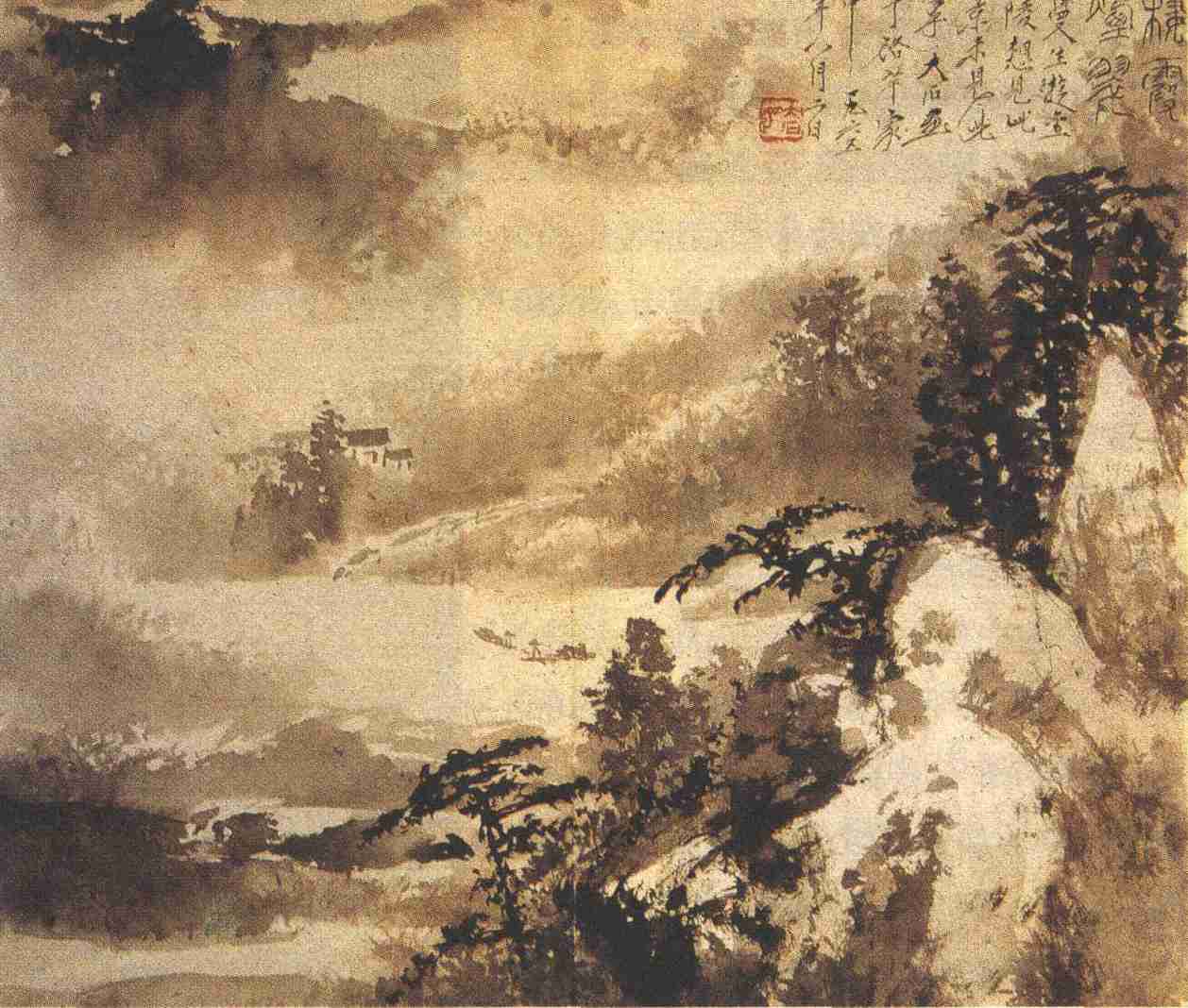 《栖霞烟翠图》,图纸仅方寸,却涵盖了宽广天地,近景右侧山石隆起,林木密茂,从山脚迤逦而上,上、中、下三处各耸起浓黑大松,倍见醒目。图中央为宽敞河道,东岸多港汊,丛生芦苇,西岸为丘陵地,远近有两处居民点,一脉清流,汨汨从里山流向河道。这西岸景色,全用淡墨点簇而成,烟翠迷远,岚气弥漫,近似上佳的水彩画,一人间仙境也。河道中央有二渔舟徜徉,各坐一隐逸高士,均戴笠,似在晤对,远处烟云迷濛,一峰耸立在隐约中,谅即凤翔峰。全图水墨淋漓,接青叠翠,山光水色,一派江南旖旎风光。小中见大,足敞胸怀。