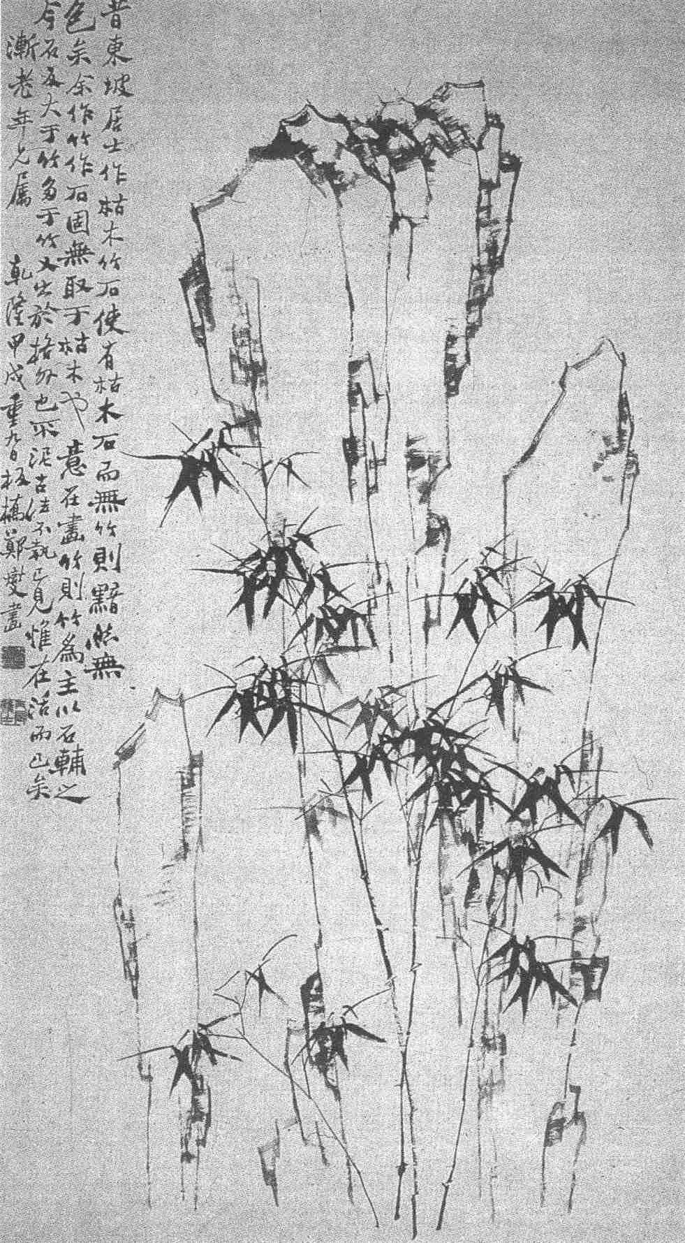 此幅《竹石图》,是郑板桥六十二岁时所作。画面上修竹四竿,长短有殊,或作左倾,或作右斜,虽各自独立,却顾盼生情,用笔遒健清劲,极疏爽飞动之致。竹后巨石居中高耸,石用中锋勾勒,笔致瘦硬秀拔,皴擦较少而神韵具足。竹用浓笔,石用淡墨,浓淡相映,妙趣横生。总观全局,气势俊迈,风神萧散,有傲然挺立、不可一世之慨。画上题句云:“昔东坡居士作枯木竹石,使有枯木石而无竹,则黯然无色矣,余作竹作石固无取于枯木也;意在画竹,则竹为主以石辅之,今石反大于竹多于竹,又出于格外也;不泥古法,不执己见,惟在活而已矣。……乾隆甲戌重九日板桥郑燮画。”钤“七品官耳”、“丙辰进士”印。这段题句,阐明了三个观点:一、作画要不落前人窠臼。尽管郑板桥对苏东坡极为钦佩,然而他并非唯古是从、食古不化的人,“但得宋元气韵在,何需依样画葫芦”,他是主张“师其意而不是师其迹”,认为“各有灵苗各自探”,追求鲜明的个性风格。二、艺术创作不能拘守陈法,要不怕出格。三、艺术创作在于不迷信古法,不固执己意,要努力做到一个“活”字。这是郑板桥艺术风格的最大特色,他发扬了“外师造化,中得心源”的画学传统,师造化而不是摹造化,是源于生活发自心灵,充分强调了画家在创作过程中的主观能动性,以及自身感情的抒发和造型艺术形式美的统一。他曾提出绘画创作中的三个阶段:“眼中之竹”、“胸中之竹”、“手中之竹”,形象地说明了主观与客观、现实和想象、真实和艺术的界限,使创作出来的作品,既源于客观事物,又高于客观现实,达到“趣在法外”的境界。因此板桥笔下的竹,不论是新竹、老竹、晴竹、雨竹、水乡之竹、山野之竹,无不赋予它们以性格和生命,达到神情毕肖,栩栩如生,富有感人的魅力,给观者带来愉悦和美的享受。