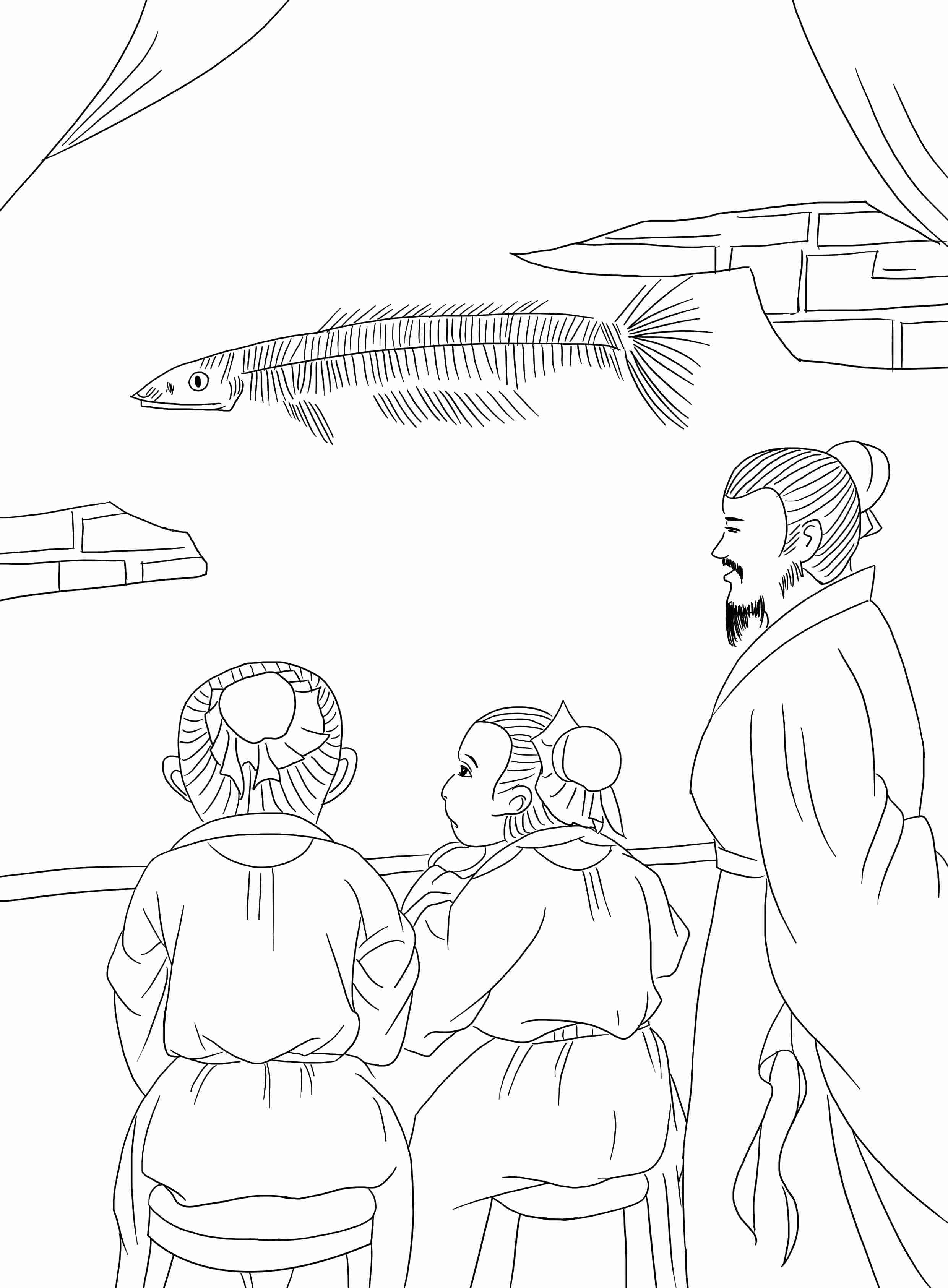 二子午餐,问父用何物下饭,父曰:“古人望梅止渴,可将壁上挂的腌鱼望一望,吃一口,这就是下饭了。”二子依法行之。忽小者叫云:“阿哥多看了一眼。”父曰:“咸杀了他。”