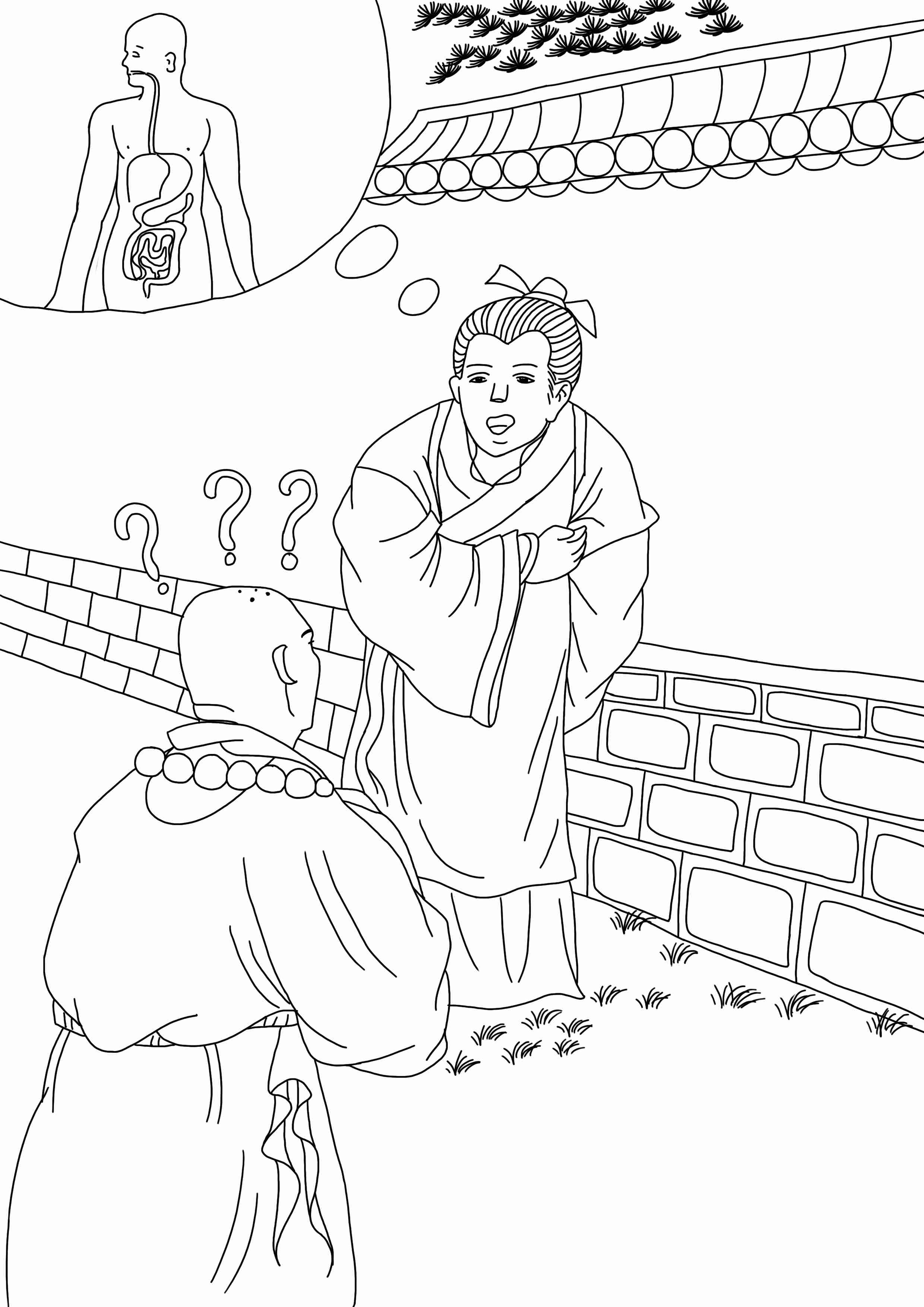 一士问僧云:“你看我腹中是甚么?”僧曰:“相公自然满腹文章在内。”士曰:“非也。”曰:“然则是五脏六腑乎?”士曰:“亦非也。”僧问何物,曰:“一肚皮和尚。若不信,现有一光头,挂出在里面。”