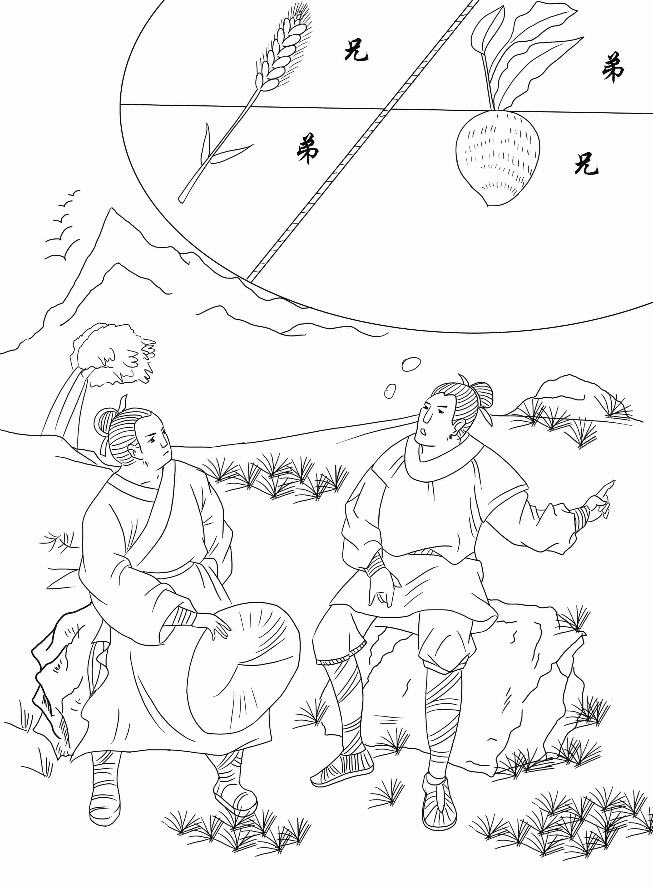 有兄弟二人种田,谷子成熟了,商量分粮食,兄对弟说:“我要上半截,你要下半截。”弟弟怪他不公平,兄说:“没关系,到明年,你取上,我取下,就平均了。”到第二年,弟弟催兄下各种,兄说:“我今年准备种芋头了。”